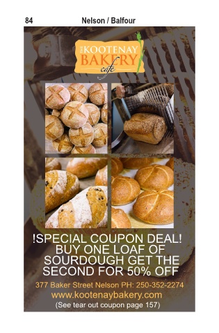 84 Nelson / Balfour !SPECIAL COUPON DEAL! BUY ONE LOAF OF SOURDOUGH GET THE SECOND FOR 50% OFF 377 Baker Street Nelson PH: 250-352-2274 www.kootenaybakery.com (See tear out coupon page 157)